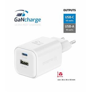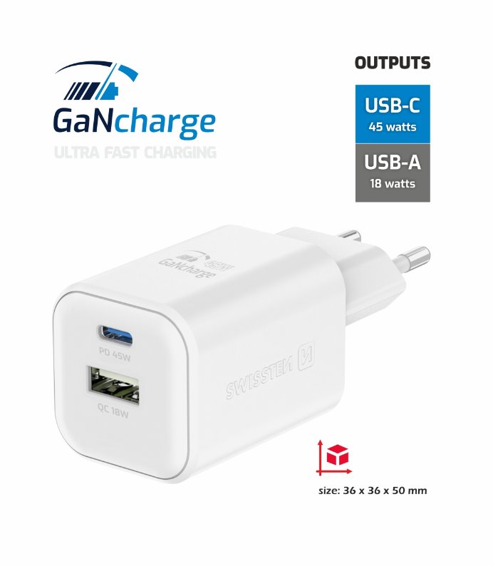 SWISSTEN SÍŤOVÝ ADAPTÉR GaN 1x USB-C 45W PD + 1x USB-A 18W QC BÍLÝ