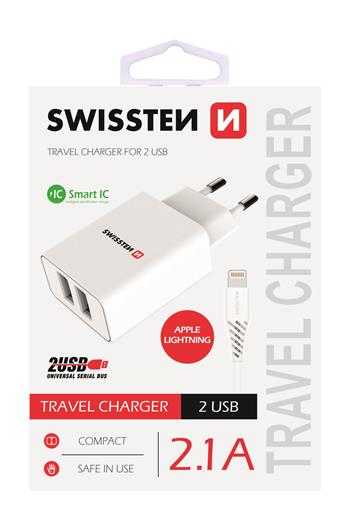 SWISSTEN SÍŤOVÝ ADAPTÉR SMART IC, CE 2x USB 2,1 A POWER BÍLÝ + DATOVÝ KABEL SWISSTEN USB / LIGHTNING 1,2 M BÍLÝ