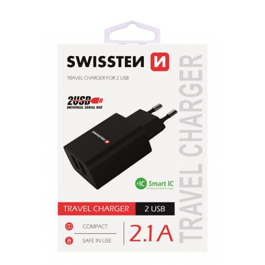SWISSTEN SÍŤOVÝ ADAPTÉR SMART IC, CE 2x USB 2,1 A POWER ČERNÝ