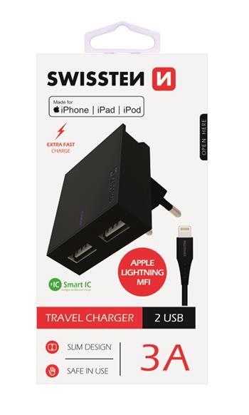 SWISSTEN SÍŤOVÝ ADAPTÉR SMART IC, CE 2x USB 3 A POWER ČERNÝ+ DATOVÝ KABEL SWISSTEN USB / LIGHTNING MFi 1,2 M ČERNÝ