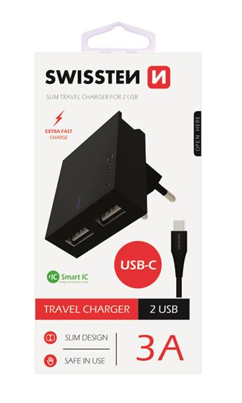 SWISSTEN SÍŤOVÝ ADAPTÉR SMART IC, CE 2x USB 3 A POWER ČERNÝ + DATOVÝ KABEL SWISSTEN USB / TYPE C 1,2 M ČERNÝ