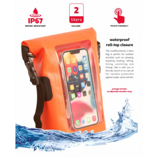 Oproti vodotěsnému pouzdru má tento bag s objemem 2l dostatek místa nejen pro smrtphone, ale i pro další cenné věci jako je třeba peněženka, doklady, klíče atd.