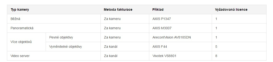 Synology Surveillance Station používá pro jednotlivé kamery, např. pro panoramatické kamery, kamery s více objektivy nebo video server pro analogové kamery, různé způsoby fakturace. Podrobnější údaje o podporovaných kamerách se dozvíte v seznamu podporovaných kamer, který