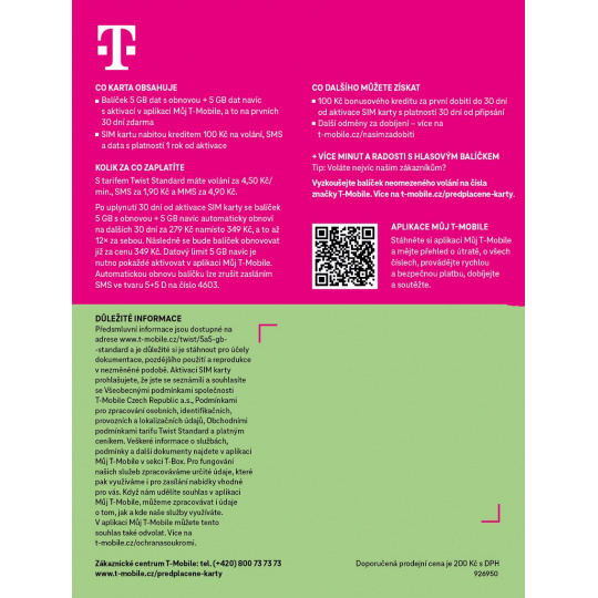 *Po uplynutí 30 dní od aktivace SIM karty se balíček 5GB s obnovou + 5GB navíc automaticky obnoví na dalších 30 dní s 20% slevou za 279Kč namísto 349 Kč, a to až dvanáctkrát za sebou. Následně se bude balíček obnovovat již za cenu 349 Kč. Datový limit 5 GB navíc je nutno pokaždé aktivovat v aplikaci Můj T-Mobile.