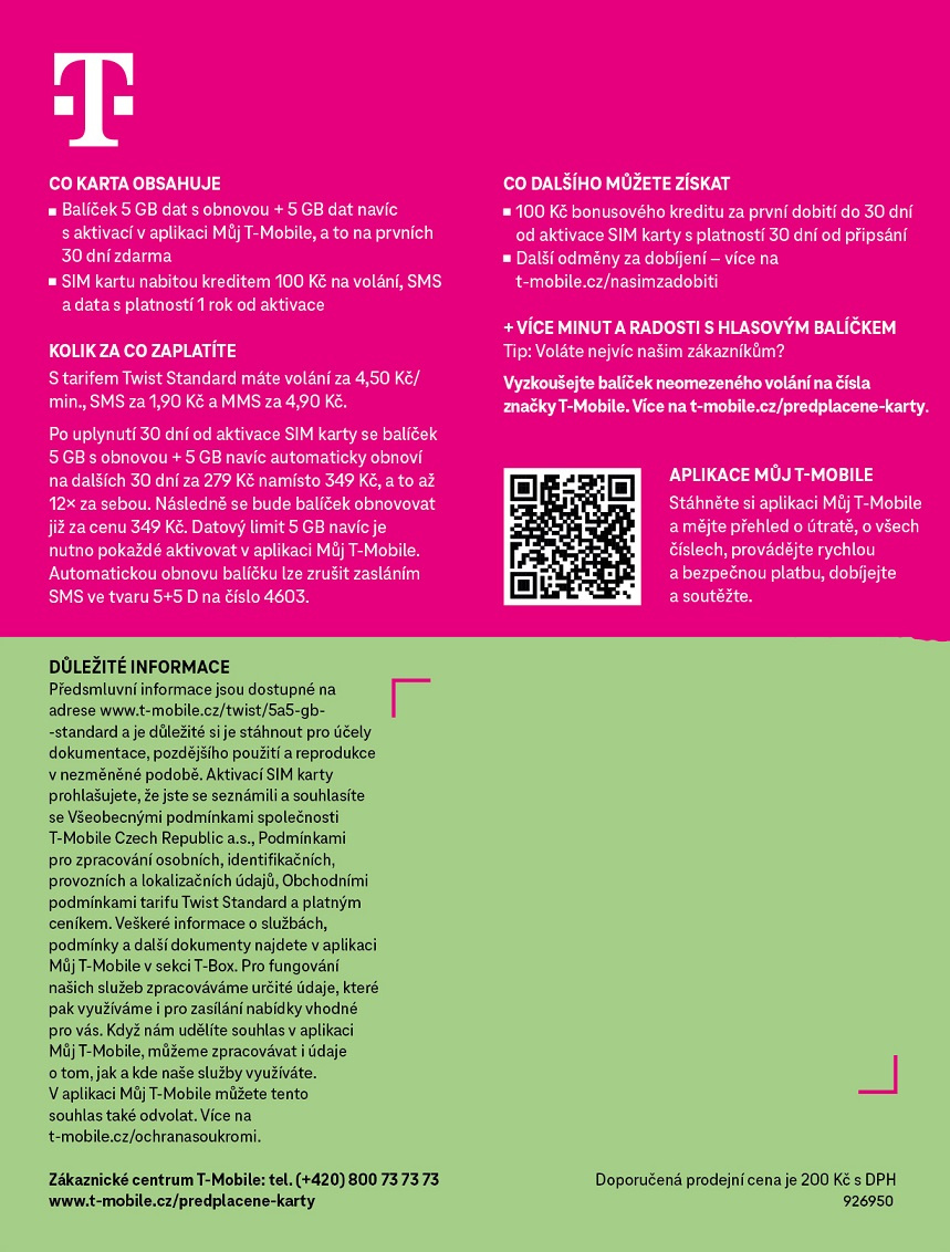 Předplacená karta od T-Mobilu 10GB SAP: 700656 EAN: 8595108709587 Váha: 32g Rozměr: 10,4 x 13,7 x 0,2 cm Co karta obsahuje, jaké má výhody (5 GB + 5 GB NAVÍC V APLIKACI MŮJ T-MOBILE) Ideální karta pro náročnější uživatele mobilních dat. S balíčkem 10 GB (5 GB + 5 GB NAVÍC V APLIKACI MŮJ T-MOBILE) si obvykle užijete sociální sítě, sledování videí, hraní online her, stahování hudby a další online zábavu. Karta obsahuje: *Balíček 5GB s obnovou + 5GB navíc na prvních 30 dní zdarma. Datový limit 5 GB navíc je nutno aktivovat v aplikaci Můj T-Mobile. *SIM kartu nabitou počátečním kreditem 100 Kč na volání, SMS a data s platností 1 rok od aktivace karty. *Po uplynutí 30 dní od aktivace SIM karty se balíček 5GB s obnovou + 5GB navíc automaticky obnoví na dalších 30 dní s 20% slevou za 279Kč namísto 349 Kč, a to až dvanáctkrát za sebou. Následně se bude balíček obnovovat již za cenu 349 Kč. Datový limit 5 GB navíc je nutno pokaždé aktivovat v aplikaci Můj T-Mobile. *Navíc, za první dobití do 30 dní od aktivace SIM karty získáte 100 Kč bonusového kreditu navíc s platností 30 dní od jeho připsání. + spoustu další výhod v podobě dat nebo volaní zdarma za dobiti, detaily na www.nasimzadobiti.cz