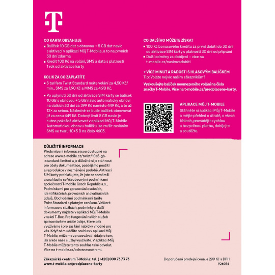 *Po uplynutí 30 dní od aktivace SIM karty se balíček 10GB s obnovou + 5GB navíc automaticky obnoví na dalších 30 dní s 10% slevou za 399Kč namísto 449 Kč, a to až dvanáctkrát za sebou. Následně se bude balíček obnovovat již za cenu 449 Kč. Datový limit 5 GB navíc je nutno pokaždé aktivovat v aplikaci Můj T-Mobile.