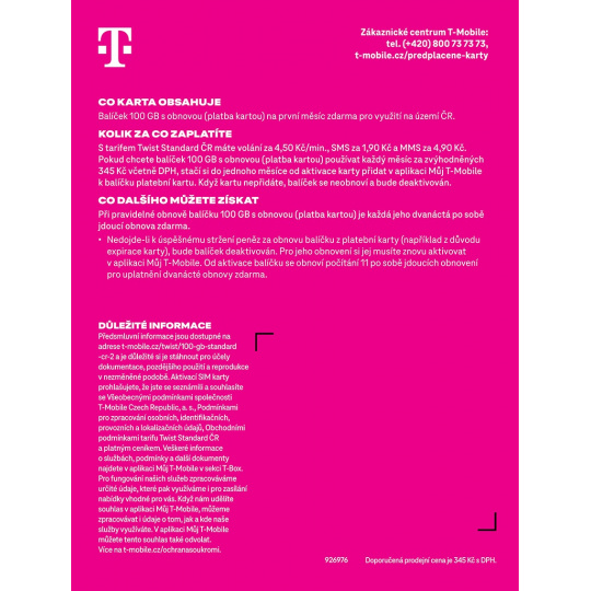 CO KARTA OBSAHUJE Balíček 100 GB s obnovou (platba kartou) na první měsíc zdarma pro využití na území ČR. Pokud chcete balíček 100 GB s obnovou (platba kartou) používat každý měsíc za zvýhodněných 345 Kč včetně DPH, stačí si do jednoho měsíce od aktivace karty přidat v aplikaci Můj T-Mobile k balíčku platební kartu. Když kartu nepřidáte, balíček se neobnoví a bude deaktivován. CO DALŠÍHO MŮŽETE ZÍSKAT Při pravidelné obnově balíčku 100 GB s obnovou (platba kartou) je každá jeho dvanáctá po sobě jdoucí obnova zdarma. Nedojde-li k úspěšnému stržení peněz za obnovu balíčku z platební karty (například z důvodu expirace karty), bude balíček deaktivován. Pro jeho obnovení si jej musíte znovu aktivovat v mobilní aplikaci Můj T-Mobile. Od aktivace balíčku se obnoví počítání 11 po sobě jdoucích obnovení pro uplatnění dvanácté obnovy zdarma.