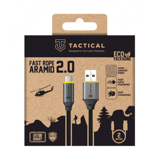 Tactical Fast Rope Aramid 2.0 Kabel USB-A/USB-C 2m Kabel s vysokou odolností pro každodenní použití, který nabízí rychlé 15W nabíjení a zvládne napájet telefon, tablet i notebook. Podporuje přenos dat až do rychlosti 5 Gb/s. Zesílený aramidovým vláknem, aby vydržel i ty nejnáročnější podmínky. Opletení z odolného nylonu zajišťuje maximální pevnost a dlouhou životnost. Fast Rope 2.0 je vybaven originálními konektory ze slitiny hliníku, které prodlužují životnost kabelu. Testováno dle MIL-STD. Specifikace: Výkon: 15W Přenosová rychlost: Až 5Gbps Materiál těla konektorů: Kov Norma MIL-STD-810H 516.8: Splněna Délka kabelu: 2 metry Značka: Tactical Záruka: 2 roky