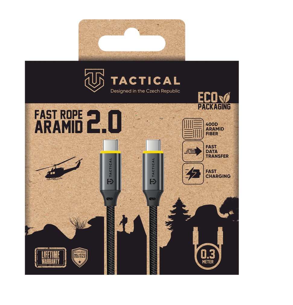 Tactical Fast Rope Aramid 2.0 Kabel USB-C/USB-C 0,3m Kabel s vysokou odolností pro každodenní použití, který nabízí rychlé 100W nabíjení a zvládne napájet telefon, tablet i notebook. Podporuje přenos dat až do rychlosti 10 Gb/s. Zesílený aramidovým vláknem, aby vydržel i ty nejnáročnější podmínky. Opletení z odolného nylonu zajišťuje maximální pevnost a dlouhou životnost. Fast Rope 2.0 je vybaven originálními konektory ze slitiny hliníku, které prodlužují životnost kabelu. Testováno dle MIL-STD. Specifikace: Výkon: 100W Přenosová rychlost: Až 10Gbps Materiál těla konektorů: Kov Norma MIL-STD-810H 516.8: Splněna Délka kabelu: 0,3 metrů Značka: Tactical Záruka: 2 roky