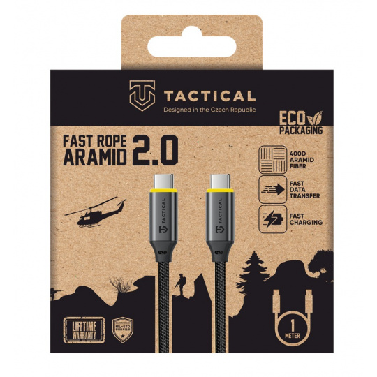 Tactical Fast Rope Aramid 2.0 Kabel USB-C/USB-C 1m Kabel s vysokou odolností pro každodenní použití, který nabízí rychlé 100W nabíjení a zvládne napájet telefon, tablet i notebook. Podporuje přenos dat až do rychlosti 10 Gb/s. Zesílený aramidovým vláknem, aby vydržel i ty nejnáročnější podmínky. Opletení z odolného nylonu zajišťuje maximální pevnost a dlouhou životnost. Fast Rope 2.0 je vybaven originálními konektory ze slitiny hliníku, které prodlužují životnost kabelu. Testováno dle MIL-STD. Specifikace: Výkon: 100W Přenosová rychlost: Až 10Gbps Materiál těla konektorů: Kov Norma MIL-STD-810H 516.8: Splněna Délka kabelu: 1 metr Značka: Tactical Záruka: 2 roky