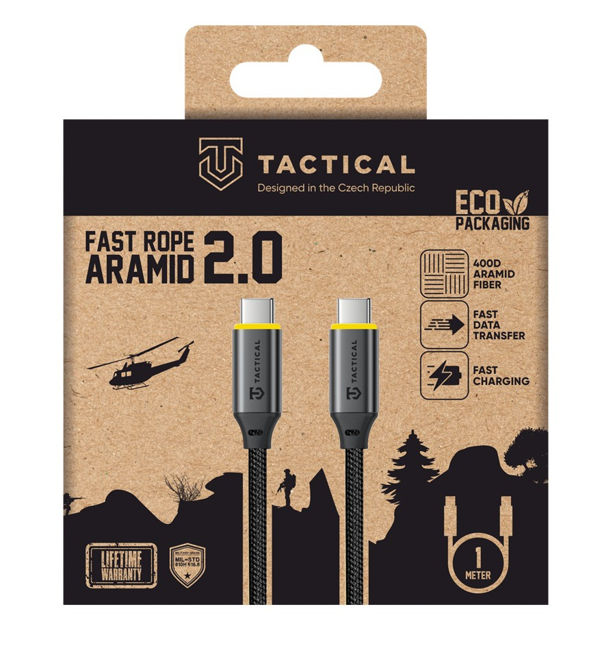 Tactical Fast Rope Aramid 2.0 Kabel USB-C/USB-C 1m Kabel s vysokou odolností pro každodenní použití, který nabízí rychlé 100W nabíjení a zvládne napájet telefon, tablet i notebook. Podporuje přenos dat až do rychlosti 10 Gb/s. Zesílený aramidovým vláknem, aby vydržel i ty nejnáročnější podmínky. Opletení z odolného nylonu zajišťuje maximální pevnost a dlouhou životnost. Fast Rope 2.0 je vybaven originálními konektory ze slitiny hliníku, které prodlužují životnost kabelu. Testováno dle MIL-STD. Specifikace: Výkon: 100W Přenosová rychlost: Až 10Gbps Materiál těla konektorů: Kov Norma MIL-STD-810H 516.8: Splněna Délka kabelu: 1 metr Značka: Tactical Záruka: 2 roky