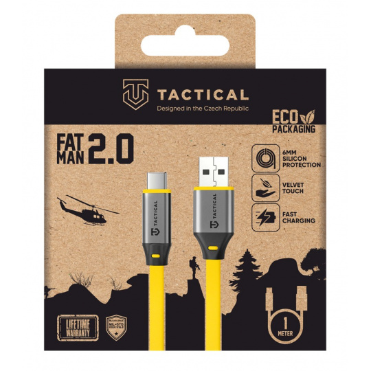 Tactical Fat Man 2.0 Kabel USB-A/USB-C 1m Žlutá Tactical Fat Man 2.0 je rychlonabíjecí kabel pro každodenní použití s výkonem až 15W. Je určený k napájení telefonu, tabletu i notebooku a díky odolnému zesílení v podobě 6mm vrstvy silikonu zvládne i náročné zacházení. Kabel je osazen originálními konektory z hliníkové slitiny, které zajišťují pevné a stabilní připojení. Připraven do akce, otestován dle normy MIL-STD. Specifikace: Výkon: 15W Ochranná vrstva kabelu: 6mm Materiál ochranné vrstvy: Silikon Norma MIL-STD-810H 516.8: Splněna Značka: Tactical Záruka: 2 roky
