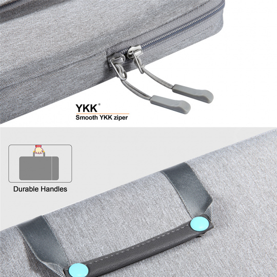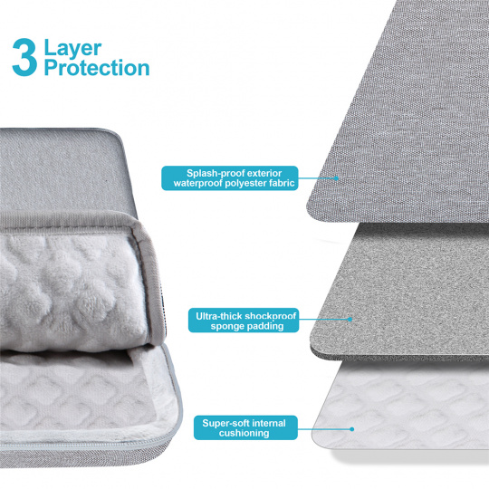 Taška je vyrobena ze tří vrstev textilie - vnější voděodolný materiál, který odolá cákancům vody, střední nárazu vzdorný materiál a vnitřní měkký materiál. Díky těmto třem textiliím máte jistotu, že je vaše zařízení v bezpečí za všech okolností. Rohy brašny jsou navíc opatřeny ochranou rohů zařízení.