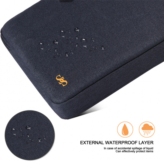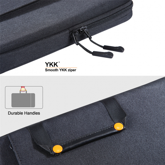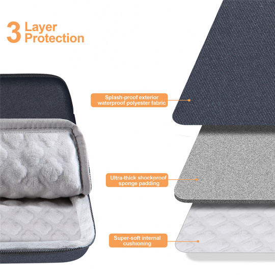 Taška je vyrobena ze tří vrstev textilie - vnější voděodolný materiál, který odolá cákancům vody, střední nárazu vzdorný materiál a vnitřní měkký materiál. Díky těmto třem textiliím máte jistotu, že je vaše zařízení v bezpečí za všech okolností. Rohy brašny jsou navíc opatřeny ochranou rohů zařízení.