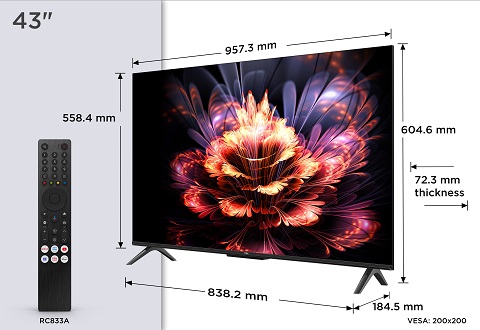 Televize – Google TV, LED, 109cm, 4K Ultra HD, 50/60 Hz, HDR10, antireflexní obraz, DVB-T2/S2/C, 3× HDMI, 1× USB, LAN, WiFi, Bluetooth, DLNA, Chromecast, Miracast, HbbTV 2.0.3, herní režim, hlasové ovládaní, Google Assistant, Apple Airplay 2, párování s mobilním zařízením, Oneplay, VESA 200×200, repro 20 W, Dolby Audio, Prostorový zvuk, Dolby Digital Plus, energetická třída F