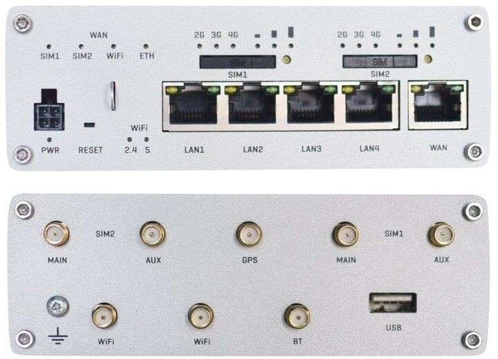 - Antény: 4 x SMA pro LTE, 2 x RP-SMA pro WiFi, 1 x RP-SMA pro Bluetooth, 1 x SMA pro GNNS.
