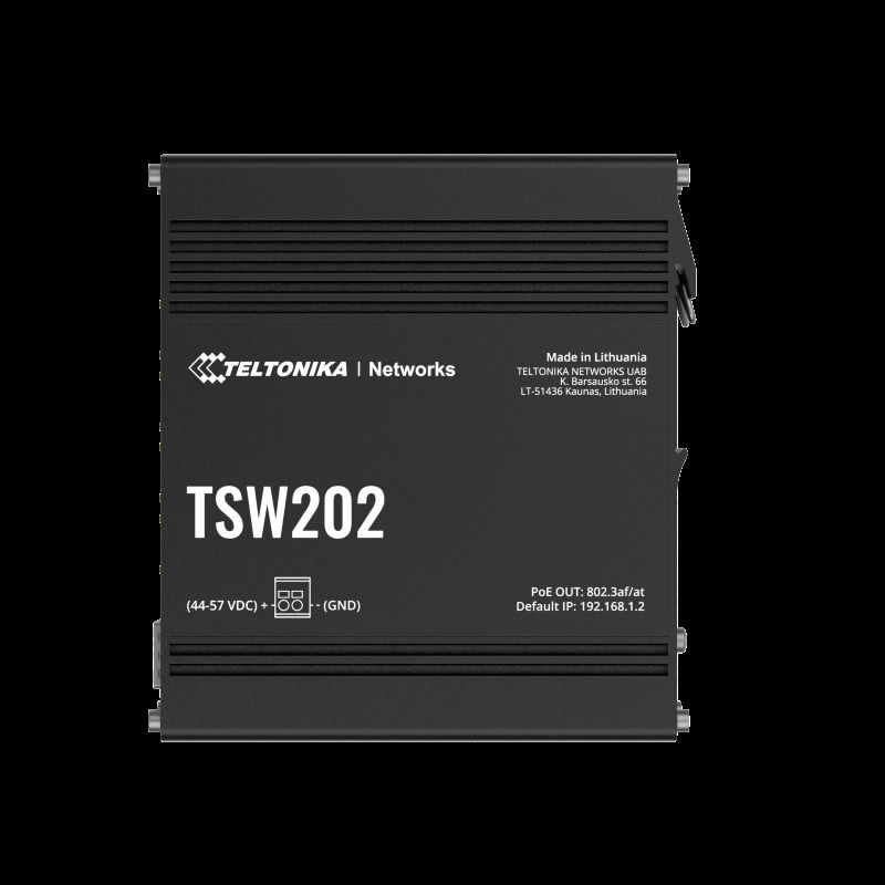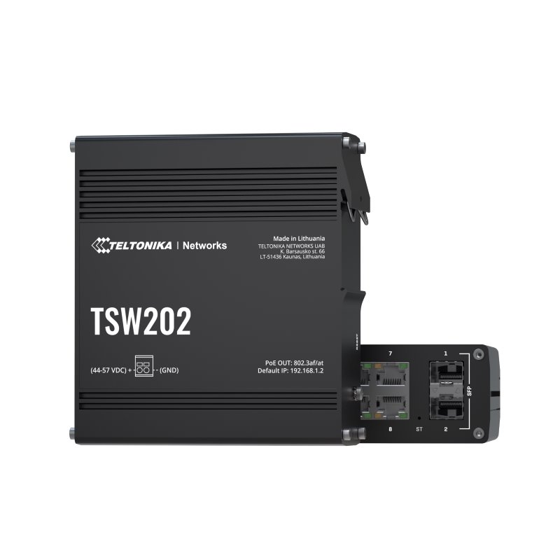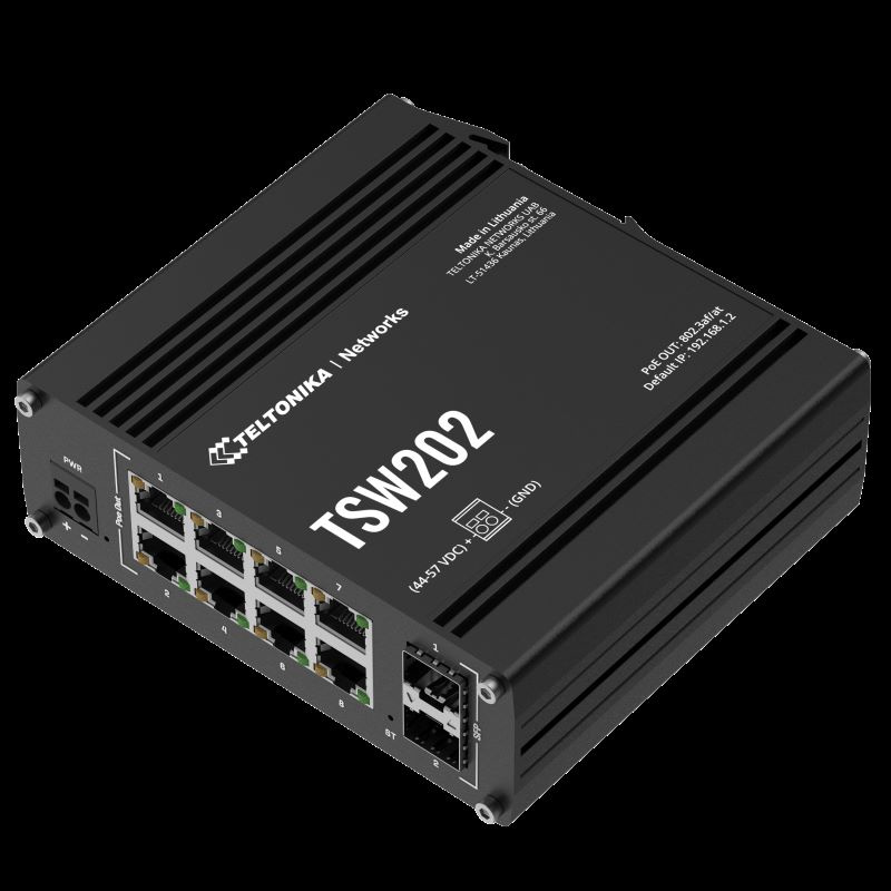 Průmyslový managed switch Teltonika TSW202 od společnosti Teltonika Networks je vůbec prvním PoE+ přepínačem, který byl navržen tak, aby poskytoval svým uživatelům široké možnosti správy sítě a zároveň centralizoval distribuci napájení. Díky PoE+ je umožněna flexibilita při správě řešení a napájení, dále je vylepšená komunikace M2M s podporou široké škály průmyslových protokolů včetně EtherNet/IP, Profinet a MRP. TSW202 je vybaven 8 Gigabit Ethernet porty, z nichž každý poskytuje 30W výkonu a zároveň má 2 vysoce výkonné SFP porty pro dálkovou komunikaci pomocí optických vláken.