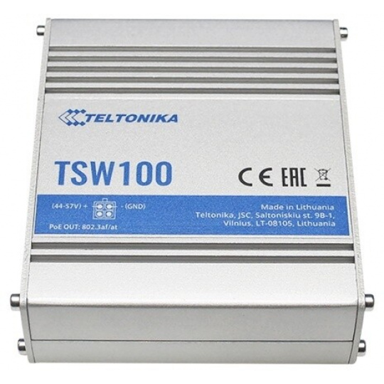 Průmyslový unmanaged switch Teltonika TSW100 od společnosti Teltonika Networks je nespravovaný gigabitový ethernetový přepínač s podporou napájení přes ethernet, který nabízí celkem 5 portů RJ-45 (4 z nich s podporou PoE 802.3af/at). Je klasifikován jako zařízení se zdrojem napájení (PSE), centralizuje napájení, poskytuje až 30 W na port (celkový výkon až 120 W) a snižuje nároky na instalaci.