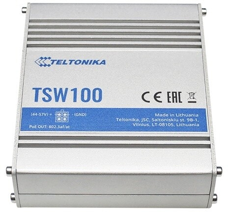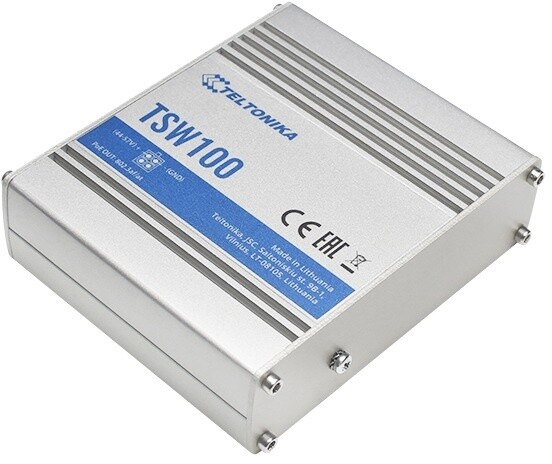 Průmyslový unmanaged switch Teltonika TSW100 od společnosti Teltonika Networks je nespravovaný gigabitový ethernetový přepínač s podporou napájení přes ethernet, který nabízí celkem 5 portů RJ-45 (4 z nich s podporou PoE 802.3af/at). Je klasifikován jako zařízení se zdrojem napájení (PSE), centralizuje napájení, poskytuje až 30 W na port (celkový výkon až 120 W) a snižuje nároky na instalaci.