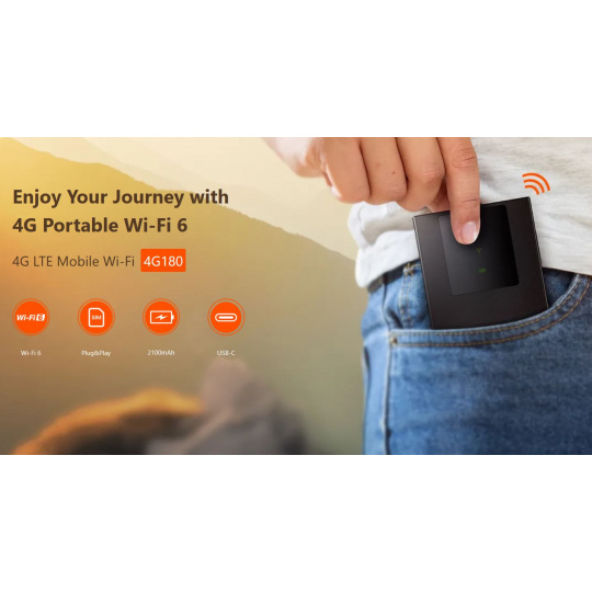 Bezdrátový 4G LTE / 3G bateriový router s Wi-Fi 6 (802.11ax/b/g/n). Baterie 2100mAh, výdrž až 8,5 hodin. Slot pro standardní kartu nanoSIM. 4x LED indikace, podpora WPA3 / WPA2 / WPA. Port USB-C pro nabíjení.