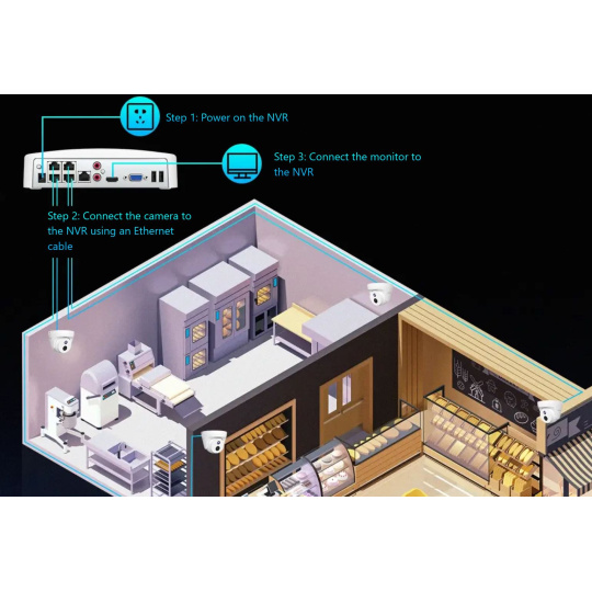 Porty: 4x LAN PoE RJ45 port 10/100 Mb/s pro připojení kamer, 1x LAN RJ45 port 10/100 Mb/s pro připojení k Internetu, 2x RCA zvuk, 1x HDMI, 1x VGA, 2x USB 2.0, 1x Napájecí Jack