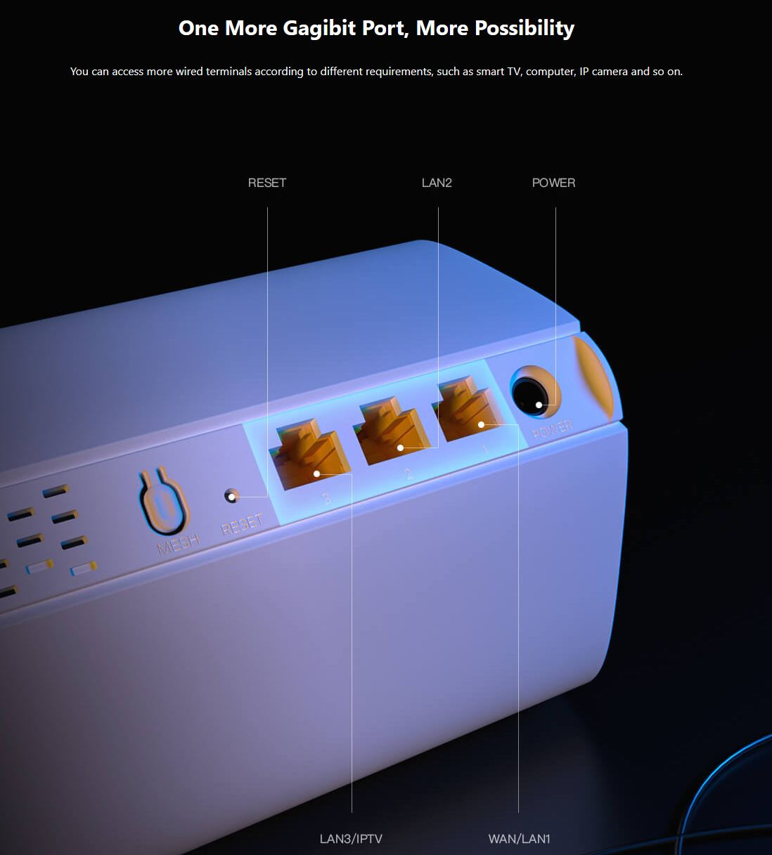 Rozhraní sekundárních satelitů: 1x tlačítko Reset, 1x tlačítko Mesh, 3x GLAN (10/100/1000 Mb/s)