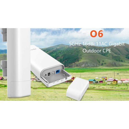 Tenda O6 je bezdrátová venkovní Wi-Fi CPE jednotka s podporou režimů přístupový bod (Access Point), Station, WISP, Repeater a Router, podporuje standard 802.11b/a/n/ac v pásmu 5 GHz s rychlostí až 867 Mb/s. Obsahuje 1x Gigabit LAN port, podporuje aktivní PoE 802.3af ale také pasivní PoE napájení (napájecí výhybka i adaptér jsou součástí balení). VPN Pass-Through, SSID Hidden, Transparent Bridge, a další technologie.