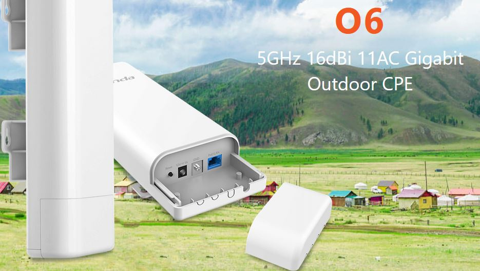 Tenda O6 je bezdrátová venkovní Wi-Fi CPE jednotka s podporou režimů přístupový bod (Access Point), Station, WISP, Repeater a Router, podporuje standard 802.11b/a/n/ac v pásmu 5 GHz s rychlostí až 867 Mb/s. Obsahuje 1x Gigabit LAN port, podporuje aktivní PoE 802.3af ale také pasivní PoE napájení (napájecí výhybka i adaptér jsou součástí balení). VPN Pass-Through, SSID Hidden, Transparent Bridge, a další technologie.