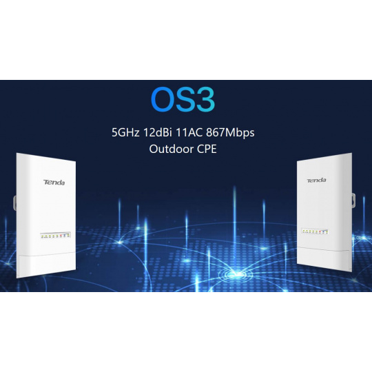 Tenda OS3 je bezdrátová venkovní Wi-Fi CPE jednotka s podporou mnoha režimů AP / Station / WISP / P2MP / WDS Repeater / Router, podporuje standard 802.11a/n/ac v pásmu 5 GHz s rychlostí až 867 Mb/s. Obsahuje 4x LAN port 10/100 Mbps, podporuje pasivní PoE napájení nebo napájecí adaptér (napájecí výhybka i adaptér jsou součástí balení). VPN Pass-Through, SSID Isolation, DDNS, DHCP, Transparent Bridge, VLAN tagging SSID, a další technologie.