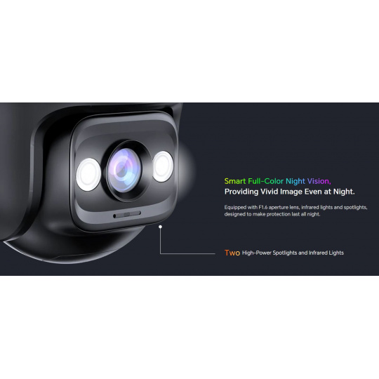 Venkovní otočná IP kamera s rozlišením 3 MPx (2304 x 1296px) a přenosem zvuku, úhel záběru 355° horizontálně a 90° vertikálně, noční vidění s dosvitem 30 m, detekce pohybu, osoby a vozidla, automatické otáčení za pohybem, vestavěný mikrofon, vestavěný reproduktor a siréna, cloud platforma, slot pro microSD kartu max. 512 GB, krytí IP65, připojení pomocí WiFi 6 nebo Ethernet portu RJ45, aplikace pro Android a iOS v češtině. Podporuje Amazon Alexa, kódování H.265, ONVIF.