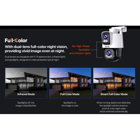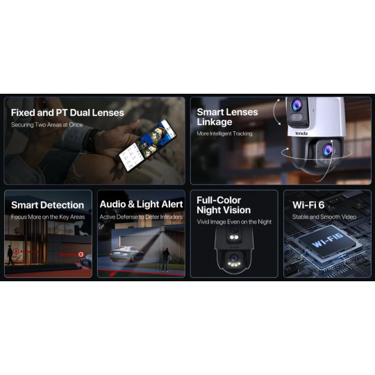 Venkovní otočná IP kamera s dvojí optikou a rozlišením celkem 6MP (2ks 2304 × 1296) a přenosem zvuku, úhel záběru 360° horizontálně a 90° vertikálně, podporou OnVif, noční vidění s dosvitem 30 m, detekce pohybu a osoby, automatické otáčení za pohybem, vestavěný mikrofon, vestavěný reproduktor a siréna, cloud platforma, slot pro SD kartu max. 512 GB, krytí IP65, připojení přes WiFi 6 a Ethernet RJ45, aplikace pro Android a iOS v češtině.