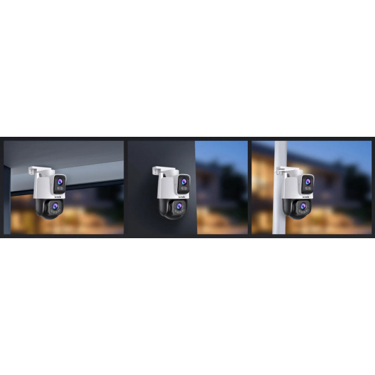Venkovní otočná IP kamera s dvojí optikou a online sledováním pomocí mobilního telefonu a tabletu. Ukládání záznamů a fotografií na microSD kartu nebo Cloud. Rozlišení 2x 3MP pro video ve vysoké kvalitě, denní i noční provoz díky IR dosvitu až 30 m, ohnisková vzdálenost u fixní kamery 4,0 mm a u otočné kamery 6,0 mm, Wi-Fi b/g/n, 1x LAN RJ45 10/100 Mb/s, mikrofon a reproduktor, slot pro microSD kartu s velikostí až 512 GB. Úhel záběru 360° horizontálně a 90° vertikálně. Kamera podporuje detekci pohybu, detekci osoby, a automatické otáčení za pohybem/osobou. Součástí balení je držák na stěnu/strop.