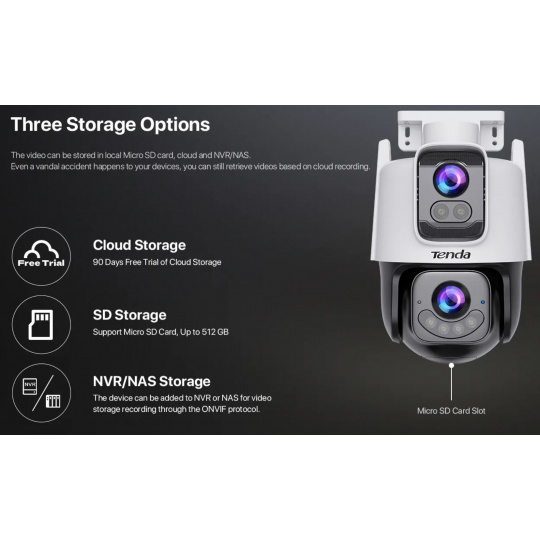 Kamera ukládá data do vnitřního nebo Cloudového úložiště. Vnitřní úložiště je tvořeno slotem pro microSD kartu maximální kapacity 512 GB. Také je možné přímo v aplikaci TDSEE přikoupit Cloudové úložiště, data jsou tak chráněna proti odcizení nebo poškození kamery. Cloudové úložiště je evropské a splňujme normy na ochranu osobních dat ISO/IEC 27018. Data jsou speciálnně kódována pomocí AES 256-bit šifrování. Onvif protokol je velmi důležitý pro připojení kamery k jiným systémům. Díky podpoře Onvif protokolu je možné kameru připojit k NVR rekordérům, NAS serverům a dalším zařízením jakékoliv značky, stačí aby podporovala standart Onvif.