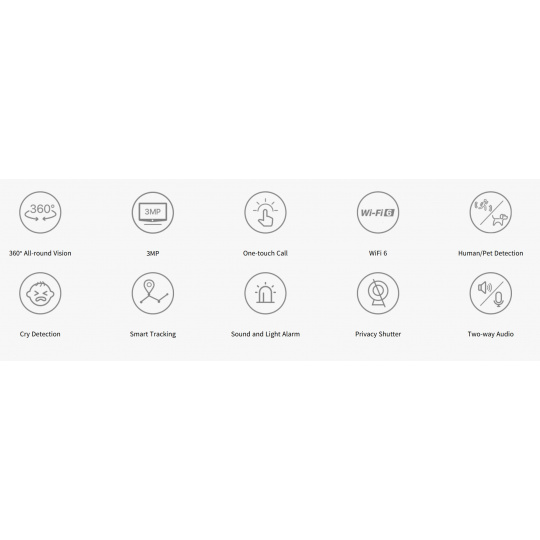 Vnitřní IP kamera s AI detekcí pohybu, WiFi 6, a 2K rozlišením 2304 x 1296 (3MP), zabezpečení WPA3-SAE, přenosem zvuku, rotace 360° horizontálně a 155° vertikálně, noční vidění s dosvitem 12 m, sledování S-Motion + S-tracking, vestavěný mikrofon, vestavěný reproduktor a siréna, cloud platforma, slot pro SD kartu max. 256 GB, detekce pláče, volání pomocí jednoho tlačítka, aplikace pro Android a iOS v češtině.