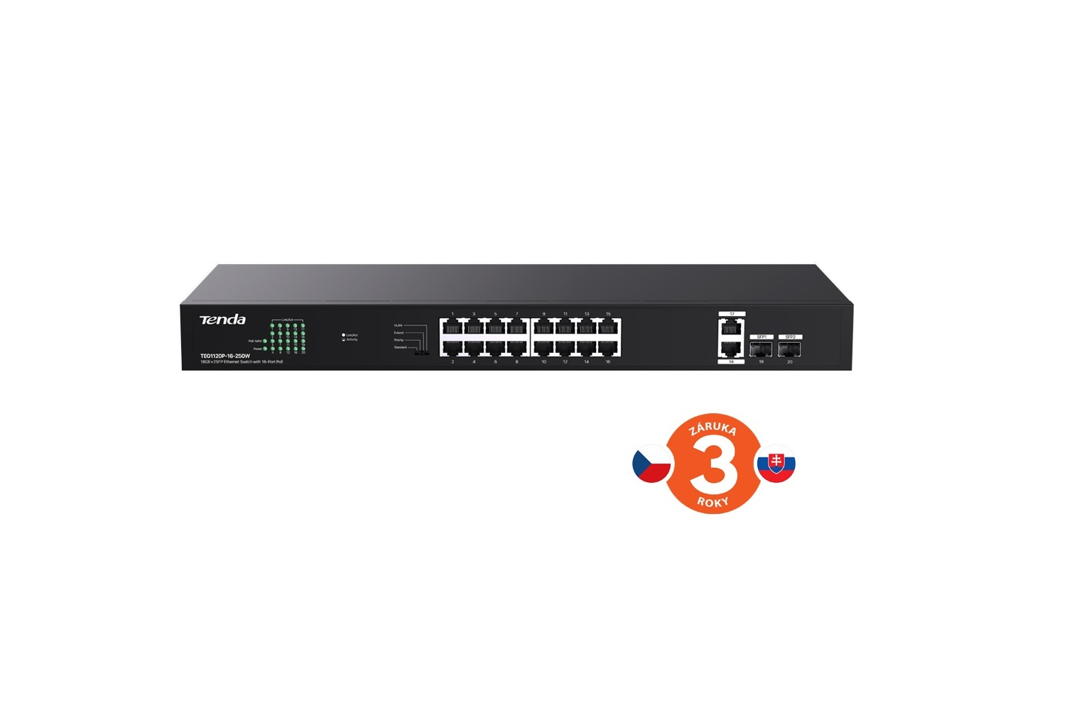 Tenda TEG1120P-16-250W přepíná data pomocí 18ti portů RJ45 a 2x SFP sloty, 16 portů 10/100/1000 Mb/s podporuje PoE802.3af/at. Switch má ochranu proti přepětí 6kV. Podpora přepojování uzlů v módu Store-and-Forward. Full-duplex kontrola toku 802.3x, half-duplex kontrola toku v režimu Back-Pressure.