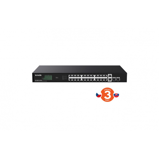Tenda TEG1128P-24-250W přepíná data pomocí 26ti portů RJ45 a 2x SFP slotů, 24 portů 10/100/1000 Mb/s podporuje PoE802.3af/at. Switch má ochranu proti přepětí 6kV. Podpora přepojování uzlů v módu Store-and-Forward. Full-duplex kontrola toku 802.3x, half-duplex kontrola toku v režimu Back-Pressure.