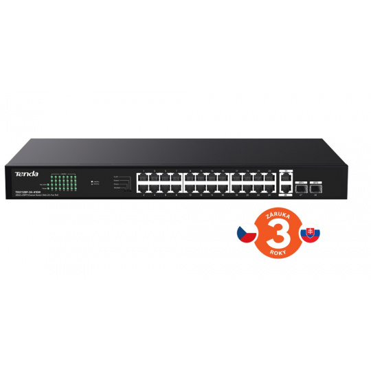 Tenda TEG1128P-24-410W přepíná data pomocí 26ti portů RJ45 a 2x SFP slotů, 24 portů 10/100/1000 Mb/s podporuje PoE802.3af/at. Switch má ochranu proti přepětí 6kV. Podpora přepojování uzlů v módu Store-and-Forward. Full-duplex kontrola toku 802.3x, half-duplex kontrola toku v režimu Back-Pressure.