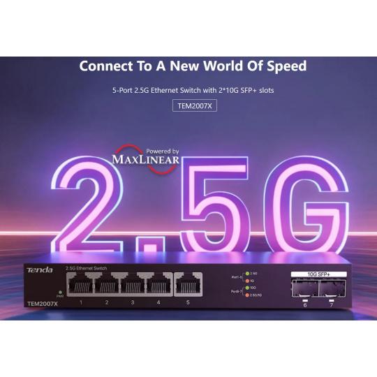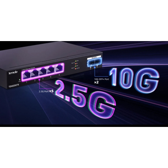 Tenda TEM2007X přepíná data pomocí 5ti portů RJ45 a 2x optického SFP+ slotu. 5 RJ45 portů 100/1000/2500 Mb/s a 2x SFP+ slot s rychlostí 100/1000/10 000 Mb/s. Switch má ochranu proti přepětí 6kV. Podpora přepojování uzlů v módu Store-and-Forward.