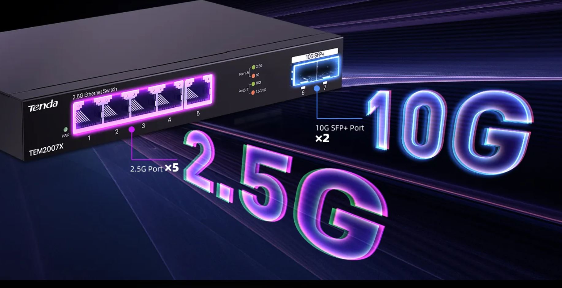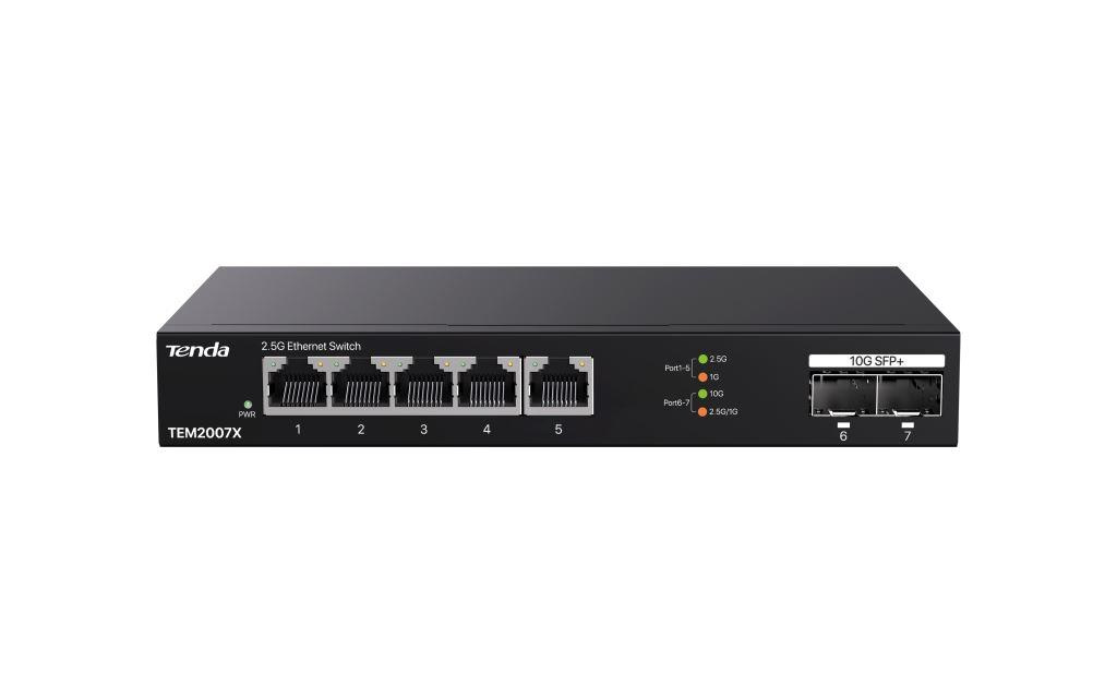 Tenda TEM2007X přepíná data pomocí 5ti portů RJ45 a 2x optického SFP+ slotu. 5 RJ45 portů 100/1000/2500 Mb/s a 2x SFP+ slot s rychlostí 100/1000/10 000 Mb/s. Switch má ochranu proti přepětí 6kV. Podpora přepojování uzlů v módu Store-and-Forward.