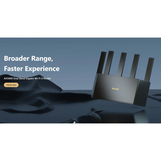 Tenda TX12L Pro AX3000 WiFi 6 Mesh Router, 1x GWAN, 3x GLAN, IPv6, 5x 6dBi, WPA 3, CZ app