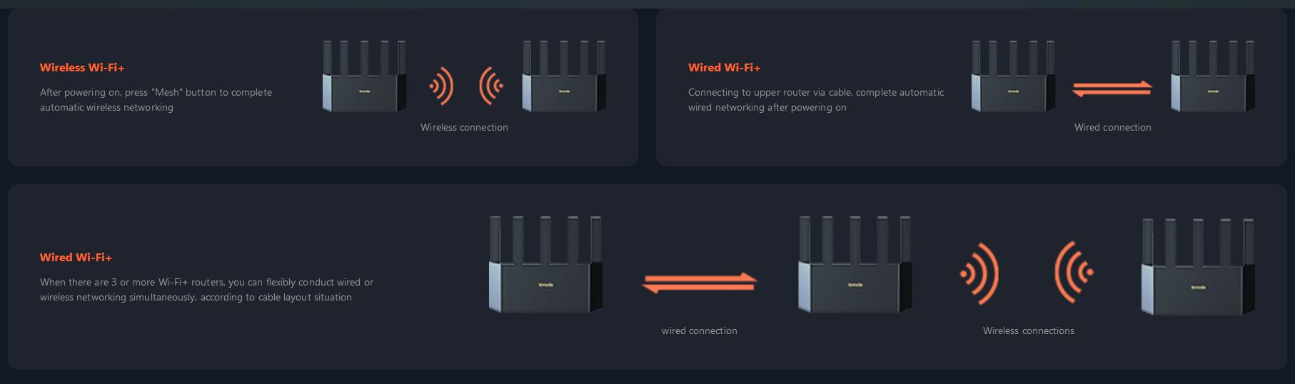 Router podporuje připojení k sítím Mesh pomocí Wi-Fi+ Mesh a je tak možné jej kombinovat s dalšími Tenda Mesh systémy.
