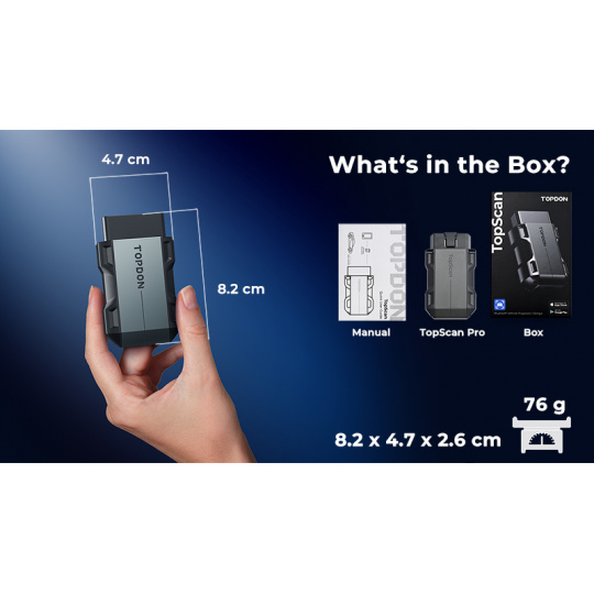 TopScan Pro - je kapesní diagnostické zařízení, které promění váš telefon ve skenovací nástroj a drží krok se svými uživateli, kteří překračují rámec základního skenování. Připojte TopScan Pro k portu OBD2 a začněte diagnostikovat prostřednictvím aplikace pro Android i iOs