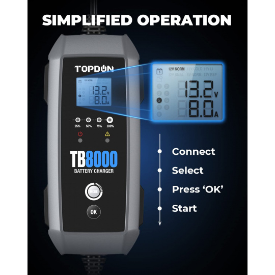 9stupňový systém inteligentního nabíjení TB8000 poskytuje uživatelům špičkovou technologii, která automaticky identifikuje stav baterie a dodává nejvhodnější proud. S tímto zařízením se již nemusíte obávat poškození baterií!