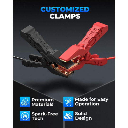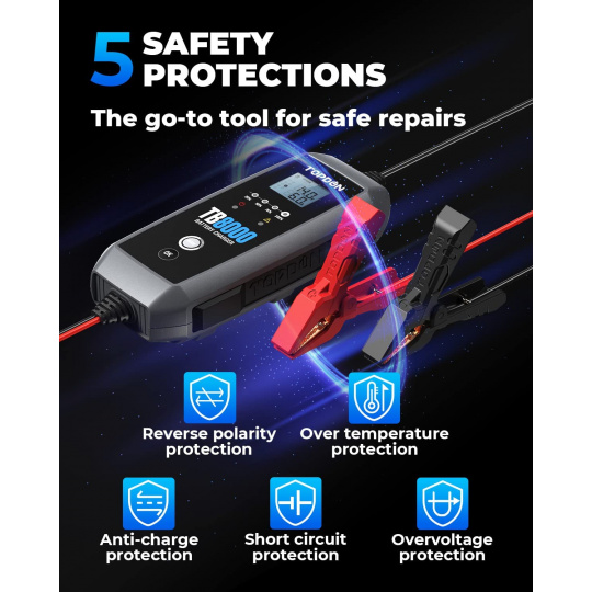 TOPDON TB 8000 nabízí vynikající bezpečnostní funkce díky 5-ti vestavěným systémům ochrany proti přepólování, zpětnému nabíjení, zkratu, přehřátí a přepětí. Navíc je tato nabíječka baterií vybavena inovativní technologií pro eliminaci jisker.