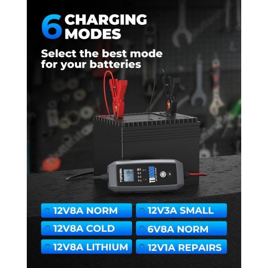 Nabíječka baterií TOPDON TB8000 nabízí dva nabíjecí proudy 8A a 3A pro baterie od 15Ah do 260Ah. S tímto Jedinečným nástrojem budete moci nabíjet baterie v automobilech, motocyklech, jachtách, nákladních automobilech, SUV, MPV, traktorech a mnoha dalších. Díky 6-ti nabíjecím režimům, 12V/8A Norm, 12V/8A Cold, 12V/8A Lithium, 12V/3A Small Norm, 6V/8A Norm a 12V Repair, si vyberete ten, který bude nejvíce vyhovovat Vašim potřebám!