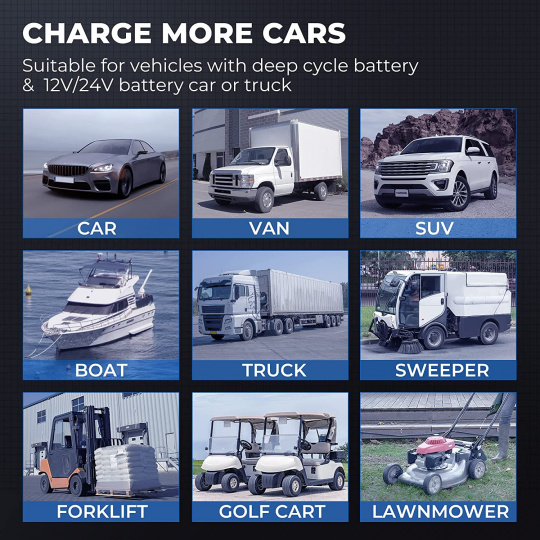 Díky podpoře 6V, 12V a 24V baterií je tato nabíječka vhodná pro více typů baterií, včetně AGM, LI WET, GEL, MF CAL a EFB!