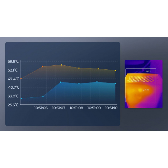 Termokamera TC002 dokáže nepřetržitě měřit teplotu a ukládat data do doprovodné aplikace. Tato data lze poté použít k výpočtu vysoké, nízké a průměrné teploty objektů v jeho zorném poli za určité časové období, což uživatelům umožňuje vizualizovat data ve formě grafu průběhu.