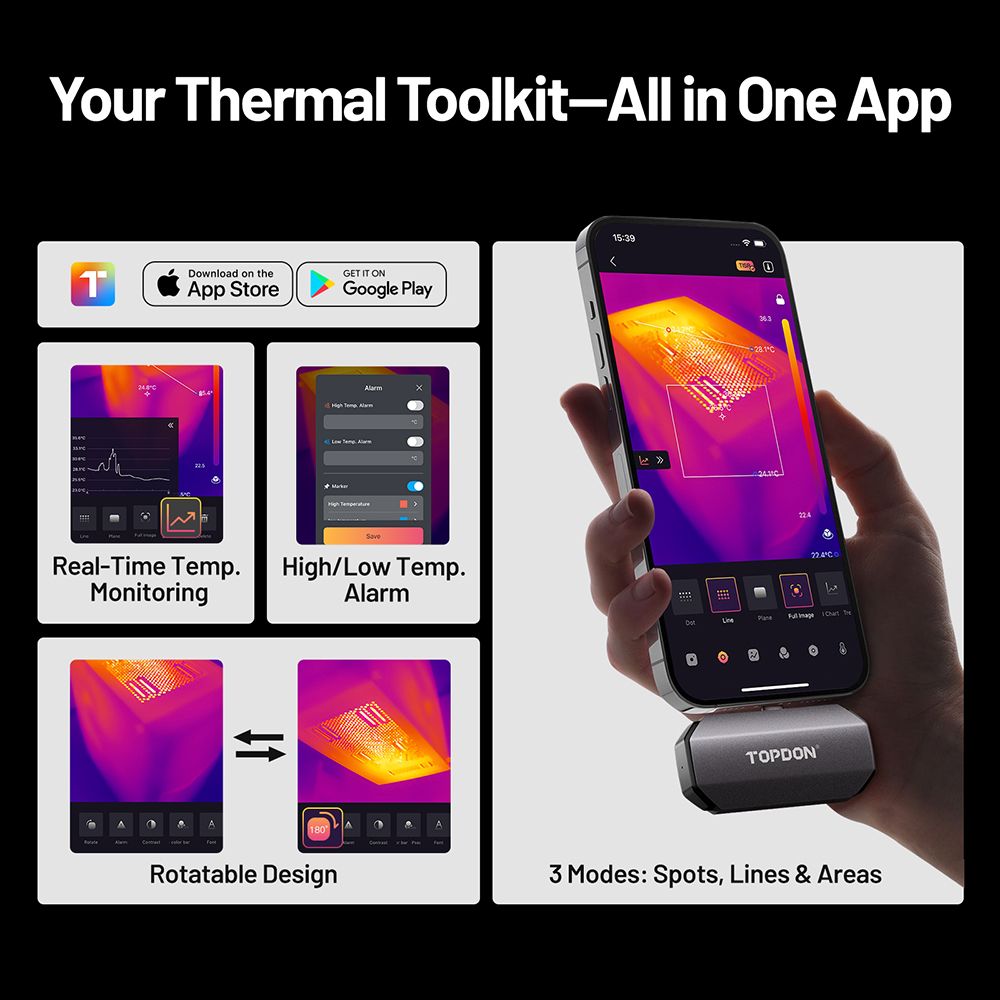 Přenosná termální infra kamera nové generace, která posouvá mobilní diagnostiku na vyšší úroveň. Připojením přes USB-C promění váš telefon, tablet nebo počítač v plnohodnotnou termokameru s detailním zobrazením.