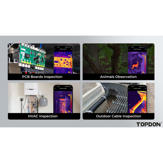 TS001 je vybavena režimy pro měření a pozorování, které poskytují přesné údaje o teplotě a intuitivní vizualizaci rozložení tepla. Je ideálním nástrojem pro profesionály, jako jsou domácí inspektoři, automobiloví technici a elektrikáři. Díky této termokameře můžete rychle odhalovat, diagnostikovat a řešit problémy s maximální přesností a efektivitou.