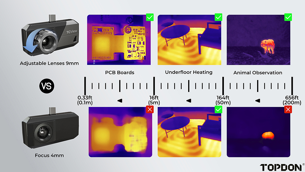 Termokamera TS001 s dlouhým ohniskem pro systém Android byla navržena pro zachycení ostrých snímků i na velmi krátké vzdálenosti, například při inspekci desek plošných spojů. Díky infračervenému snímači s vysokým rozlišením 256 × 192 pixelů a plynulé snímkové frekvenci 25 Hz dokáže precizně zachytit každý detail. Nastavitelný 9mm objektiv umožňuje pokrytí vzdáleností od 0,1 do 500 metrů, což zajišťuje širokou škálu využití, včetně inspekcí budov, pozorování zvířat, oprav automobilů nebo kontroly desek plošných spojů.